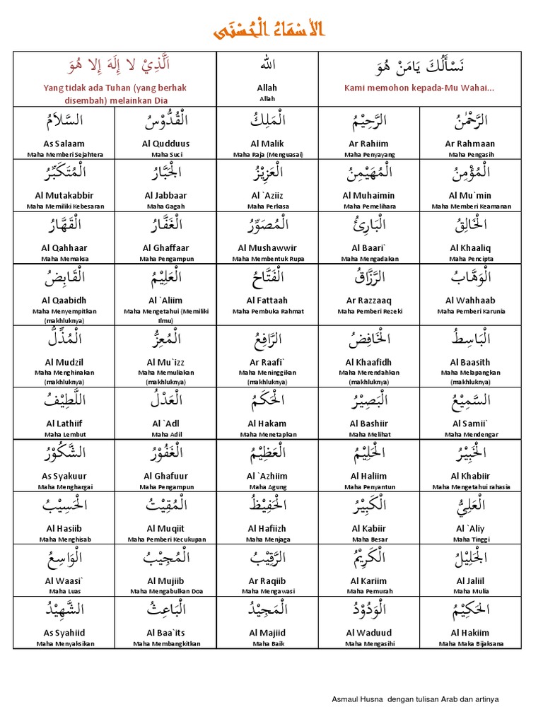 Bacaan nadhom asmaul husna (lagu asmaul husna). Di samping teks dalam bahasa arab, tersedia juga dalam tulisan latin dan terjemah, serta dilengkapi dengan doa asmaul husna. Berikut ini 99 asmaul husna, teks arab dan latin beserta arti, dalil, keutamaan dan khasiatnya. Bacaan dzikir, doa, dan wirid setelah sholat Teks asmaul husna latin :
